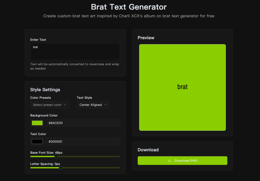 The Brat Text Generator is a free online tool designed to help users create custom text art inspired by Charli XCX's iconic 'Brat' album cover. This generator allows you to transform any text into the distinctive Brat style, complete with authentic fonts, colors, and effects, making it perfect for fans, designers, and anyone looking to create unique visual content.