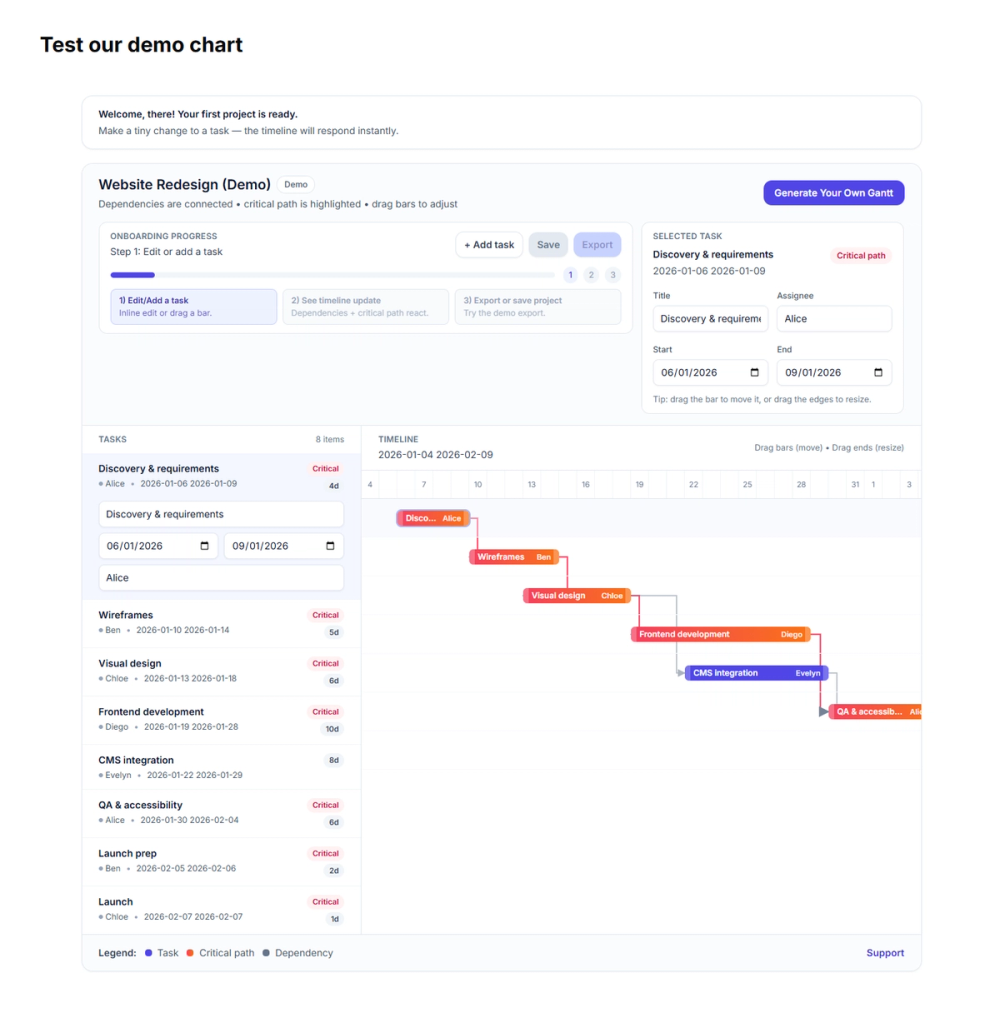 • AI-Powered Generation: Instantly turn text descriptions into visual Gantt charts. • Smart Dependencies: The AI understands task logic; moving one task auto-adjusts the entire schedule. • Unified Workflow: Seamlessly switch between Gantt, Kanban, and NoteBoard views. • Real-Time Collaboration: Invite team members and stakeholders with zero friction. • Export Ready: Share standard API access or white-label PDF exports (Enterprise).