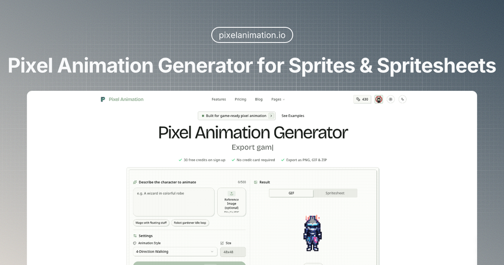 Pixel Animation Generator is an AI-powered tool designed to streamline the creation of pixel art animations, sprites, and spritesheets for various applications, primarily game development. It allows users to generate game-ready assets from simple text prompts, offering a significant acceleration to the asset production pipeline. The platform provides 30 free credits upon sign-up, requires no credit card, and supports exports in PNG, GIF, and ZIP formats.