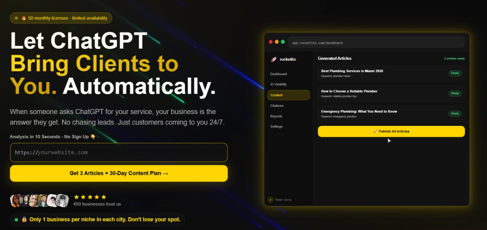 robots.txtbot access, Schema.org markup,llm.txtfiles (a new standard for AI search), and page speed, all of which influence AI visibility. - Exclusive Territory: A unique selling proposition of Rocketito is its exclusive territorial coverage. Once you subscribe, no competitor in your specific niche within your city can use Rocketito against you, effectively locking out rivals and securing your AI search dominance.