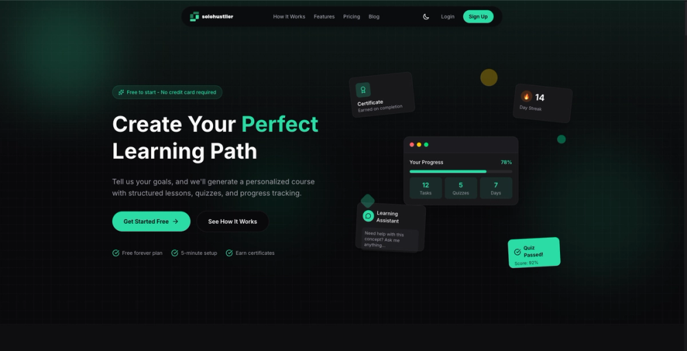 The platform simplifies the learning journey into three intuitive steps: first, users define their learning goal and weekly time commitment, allowing Solohustller to craft a perfectly aligned schedule. Second, a personalized course is generated, complete with structured modules, engaging lessons, and interactive quizzes. Finally, learners engage with the content, track their progress, maintain learning streaks, and earn verifiable certificates upon course completion, providing tangible proof of their newly acquired skills.
